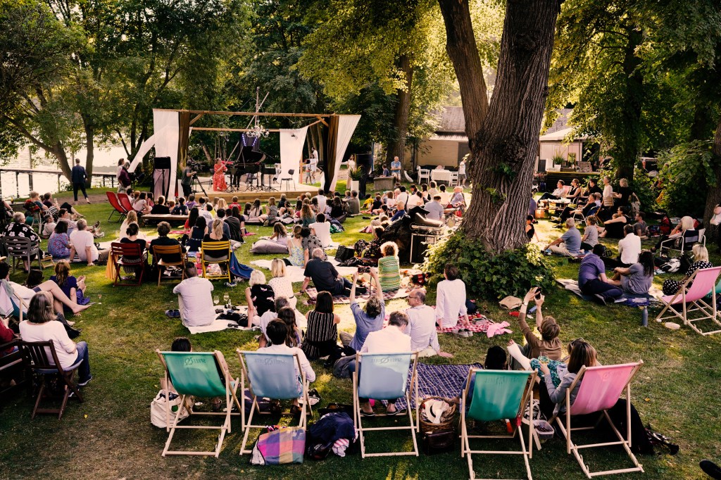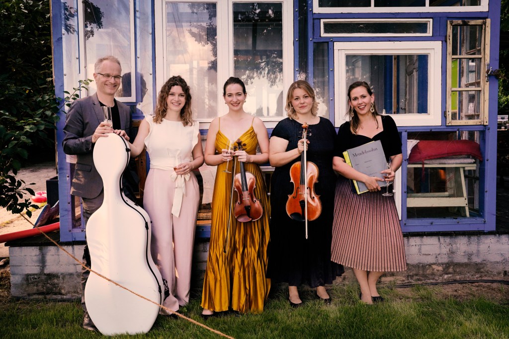 Die Cellisten Julia Hagen und Konstantin Heidrich, die Bratschistin Karolina Errera, die Geigerin Larissa Cidlinsky und die Pianistin Annika Treutler. Die Abendsonne leuchtet durch die Blätter, ich bin als Veranstalterin und als Journalistin selbstverständlich völlig objektiv, wenn ich schreibe: Sie haben gespielt, als hätten Haydn, Schumann, Mendelssohn, Schostakowitsch, Barrière, Kowalski die Musik extra für diesen Abend erfunden. Schade, dass wir keine Kritiker eingeladen haben. Foto: Felix Broede