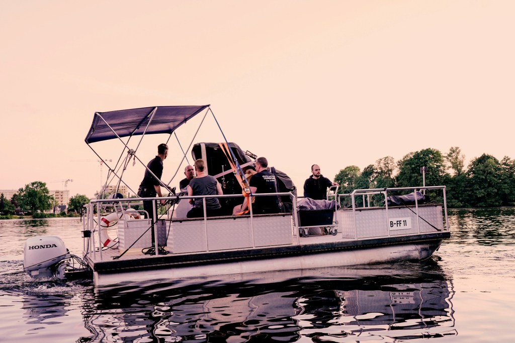 Musik hat kein Gewicht. Ein Klavier schon. Dieses hier wiegt 286 Kilo und ist schwarz lackiert, ein Steinway O-180, ein kleiner Konzertflügel, Versicherungswert: 94.000 Euro. Er soll jetzt übers Wasser. Die Klavierträger haben ihm Beine und Lyra abmontiert und ihn senkrecht auf einen Rollwagen gestellt. Als sie ihn über die Uferbefestigung auf das Pontonboot schieben und sein Gewicht ganz auf dem Boot liegt, sinken die Pontons ein paar Zentimeter tiefer in den See. Die Klavierträger wechseln stumm einen Blick. Der Himmel über Berlin ist blau.
